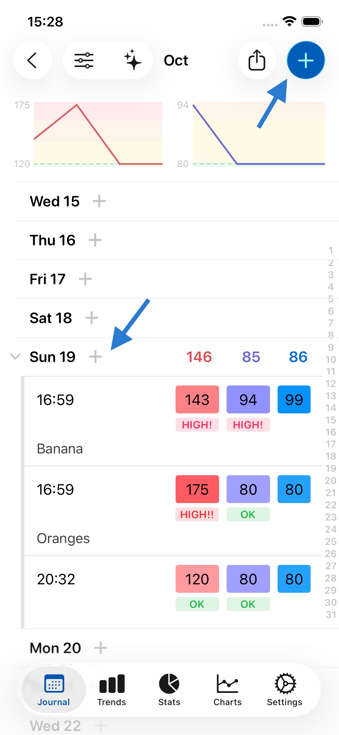 You can add a new record by either 1. pressing on the day or 2. pressing + in the top right. Both options are shown to by the arrows in the image below.