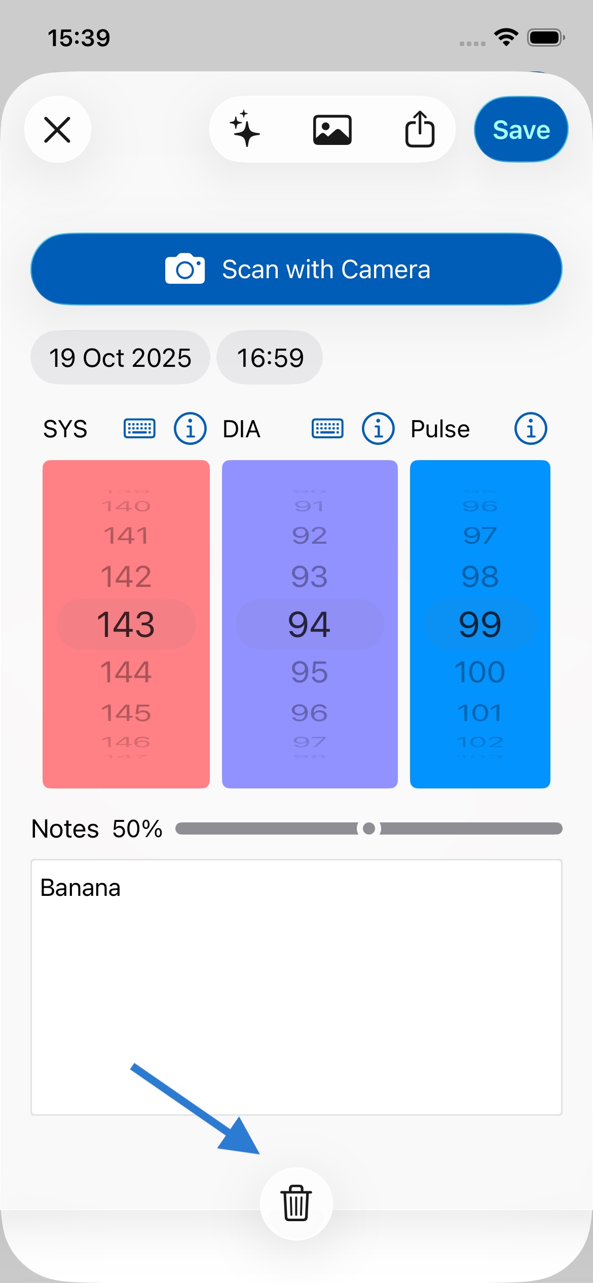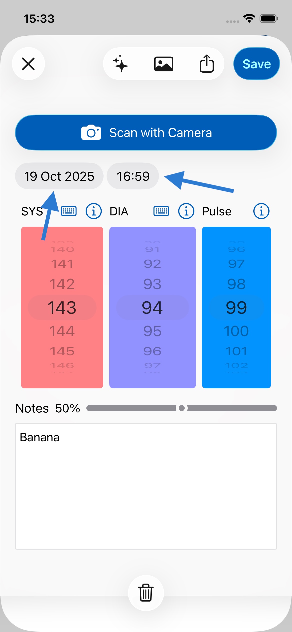 After taking your blood pressure reading, open the app and tap the "+" button, then select "Scan with Camera." Hold your phone steady about 6-12 inches away from your monitor's display, making sure the numbers are clearly visible and well-lit. The app will automatically read the systolic, diastolic, and pulse values. For best results, ensure good lighting and keep your phone steady while scanning. This works with most digital monitors including OMRON, Microlife, and Beurer brands.